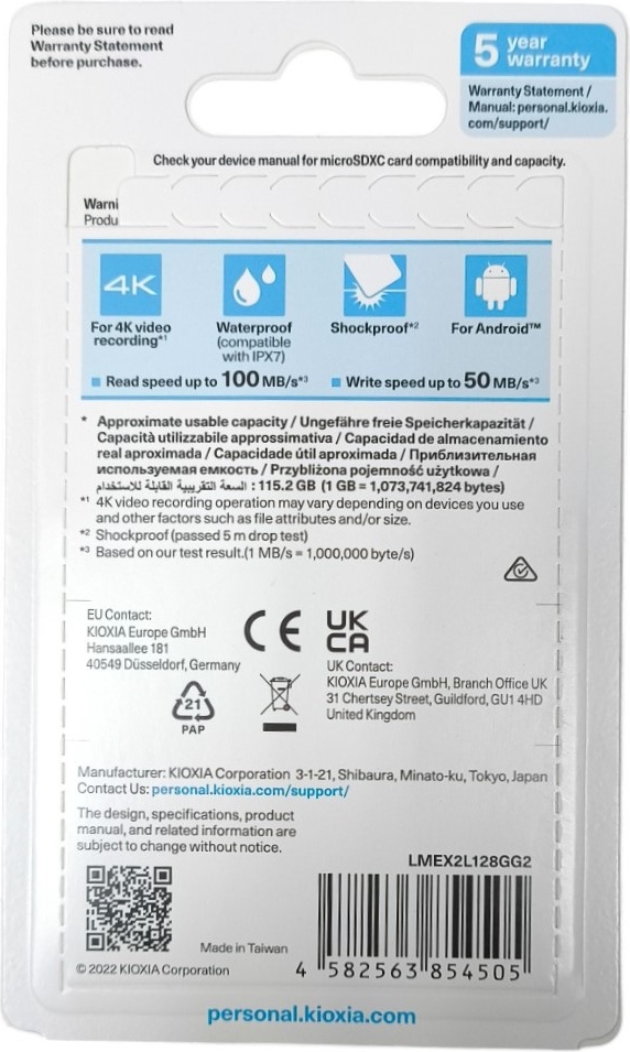 Kioxia 128GB Exceria2 Micro SDXC kart, Japonya menşeli olup, yüksek performans sunmak üzere tasarlanmıştır. UHS-I teknolojisi sayesinde, okuma ve yazma hızları oldukça yüksektir. Bu kartın en dikkat çekici özelliklerinden biri, 4K video kaydetme ve yüksek çözünürlüklü görüntülerin sorunsuz bir şekilde kaydedilmesini sağlamasıdır. Ayrıca, ürünün CE uygunluk sembolü bulunmakta olup, kalite ve güvenlik standartlarına uyduğunu göstermektedir.